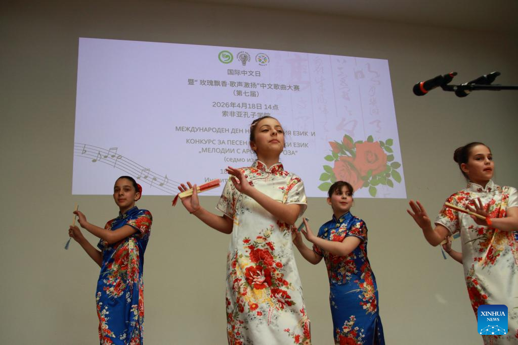 Participants perform during a Chinese singing contest in Sofia, Bulgaria, April 18, 2026. The Confucius Institute in Sofia on Saturday hosted a Chinese singing contest and inaugurated a peony culture center to celebrate this year's United Nations Chinese Language Day. (Photo by Marian Draganov/Xinhua)
