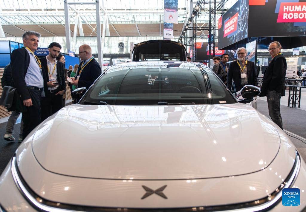 People visit the exhibition area of Xpeng at the Hannover Messe 2026 in Hannover, Germany, April 21, 2026. Hannover Messe 2026, Germany's flagship industrial trade fair, opened on Monday with industrial artificial intelligence (AI) and humanoid robots taking center stage for the first time.