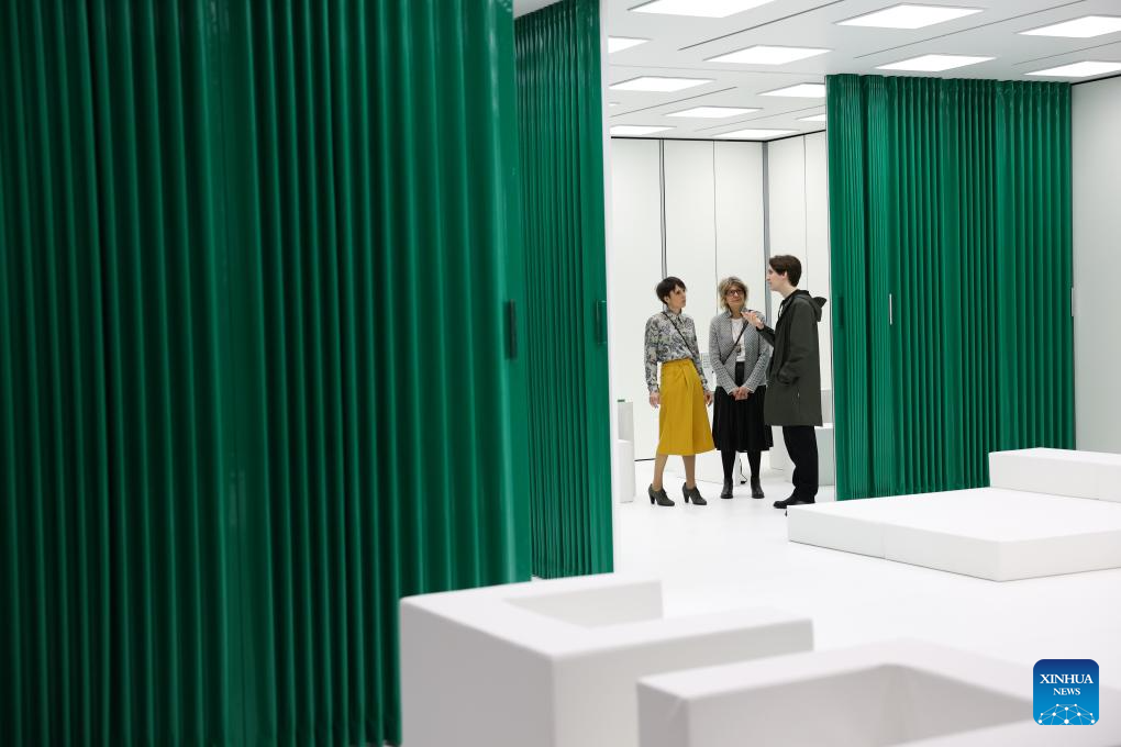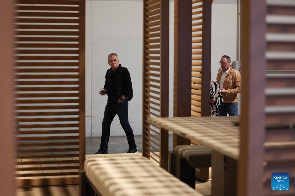 People watch an outdoor design by Yardcom and SAOTA during the 64th Salone del Mobile at Fiera Milano Rho exhibition center in Milan, Italy, April 22, 2026. The 64th Salone del Mobile, an international furniture and design industry event, is held here from April 21 to 26. (Xinhua/Li Jing)