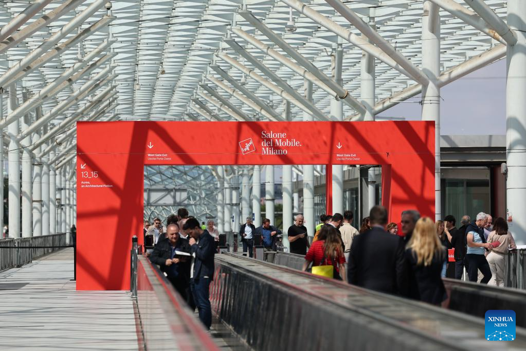 People visit the 64th Salone del Mobile at Fiera Milano Rho exhibition center in Milan, Italy, April 22, 2026. The 64th Salone del Mobile, an international furniture and design industry event, is held here from April 21 to 26. (Xinhua/Li Jing)