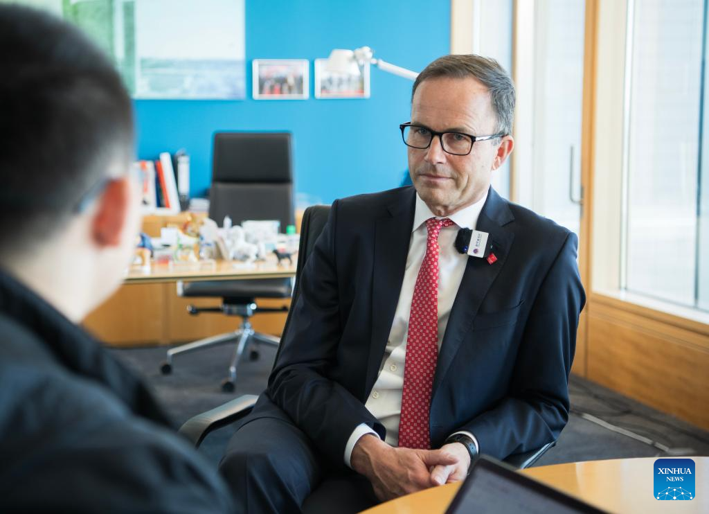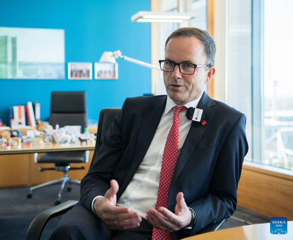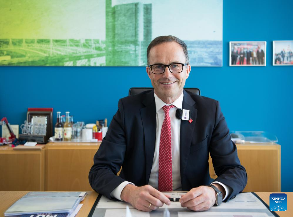 Jochen Koeckler, chairman of the managing board of Deutsche Messe AG, receives an interview with Xinhua in Hannover, Germany, April 22, 2026. (Xinhua/Zhang Haofu)