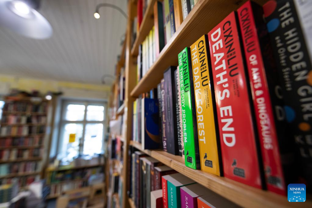 Books by science fiction author Liu Cixin are pictured in Otherland, a sci-fi bookstore in Berlin, Germany on April 16, 2026. As artificial intelligence (AI) and digital platforms reshape reading habits, bookstores in Germany are adapting by offering curated experiences and building communities to stay relevant. (Xinhua/Zhang Haofu)
