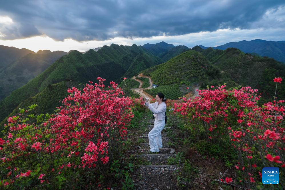 A tourist takes photos of blooming alpine azaleas in Jinling Village of Pingmen Township in Chun'an County, east China's Zhejiang Province, April 24, 2026. Located over 1,000 meters above sea level, Jinling Village is one of the highest-altitude villages in Chun'an County. In recent years, the village has leveraged its rich natural resources to develop rural cultural and eco-friendly tourism. By improving infrastructures, building camping sites and viewing platforms, as well as promoting homestays, Jinling Village has gradually established an industry centering hiking, sightseeing and summer retreat, boosting income for local villagers. (Xinhua/Xu Yu)