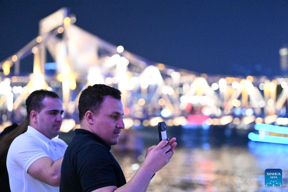 Tourists take photos as they enjoy night view in Tianjin, north China, April 24, 2026. In recent years, Tianjin has become a popular tourist destination, as the city keeps enriching its nighttime experience by expanding tourism scenarios and diversifying business formats. (Xinhua/Sun Fanyue)