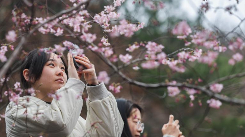 Wild cherry flowers in full bloom attract tourists in E China