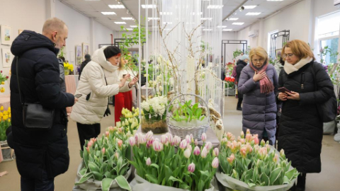 People visit flower show to celebrate upcoming International Women's Day in St. Petersburg, Russia