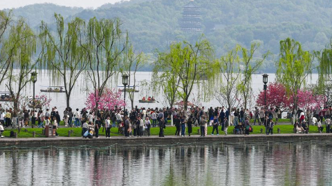 Tourists enjoy scenery of West Lake in Hangzhou