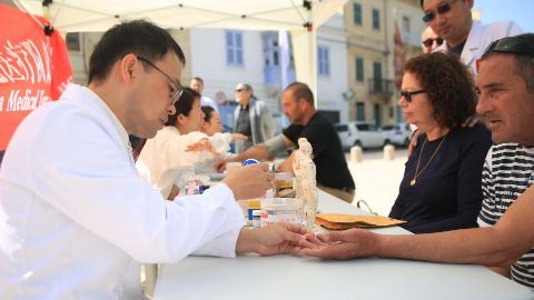 People walk on Ohrid Lake shore at sunset in North Macedonia