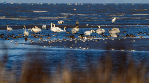 Tundra swans rest and forage at Minjiang River estuary nature reserve in China's Fujian
