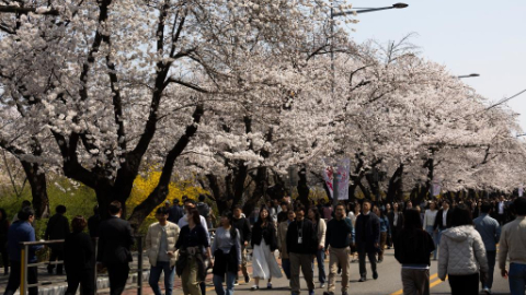 People enjoy scenery of cherry blossoms in Seoul, South Korea