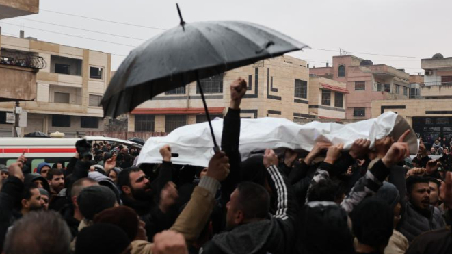 Mourners gather during funeral procession for victims of blast in Homs, central Syria