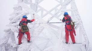 Power maintenance staff ensure power grid stability amid severe icing in China's Hubei