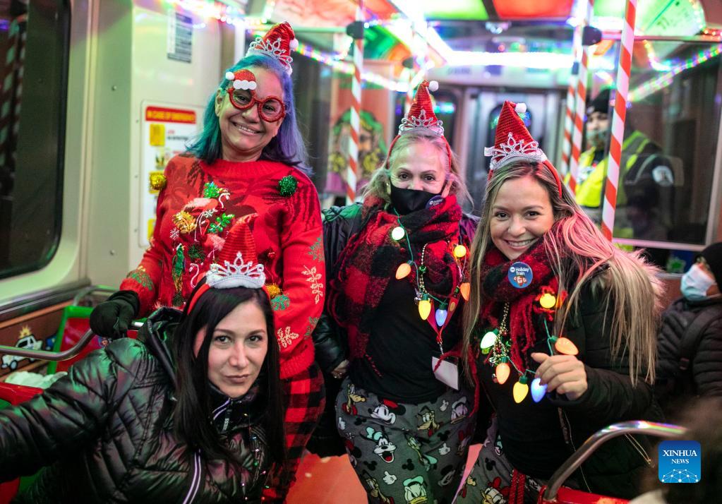 People take the Holiday Train on the Blue Line in Chicago, the United States, Dec. 18, 2021. The year of 2021 marks the 30th anniversary for the Holiday Train service by Chicago Transit Authority. (Photo by Joel Lerner/Xinhua)