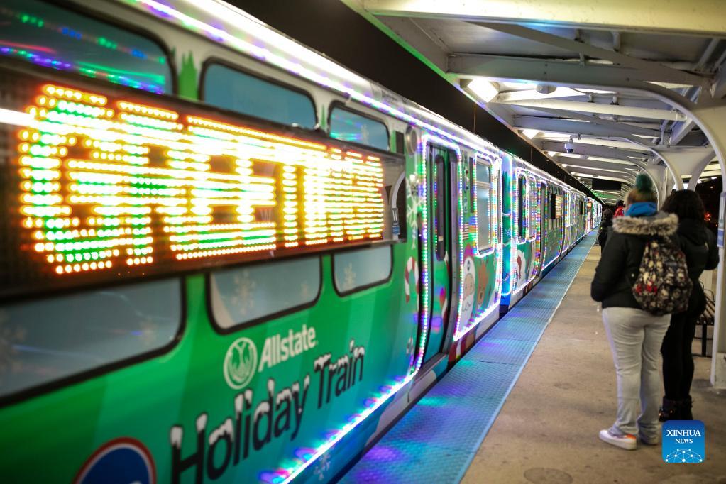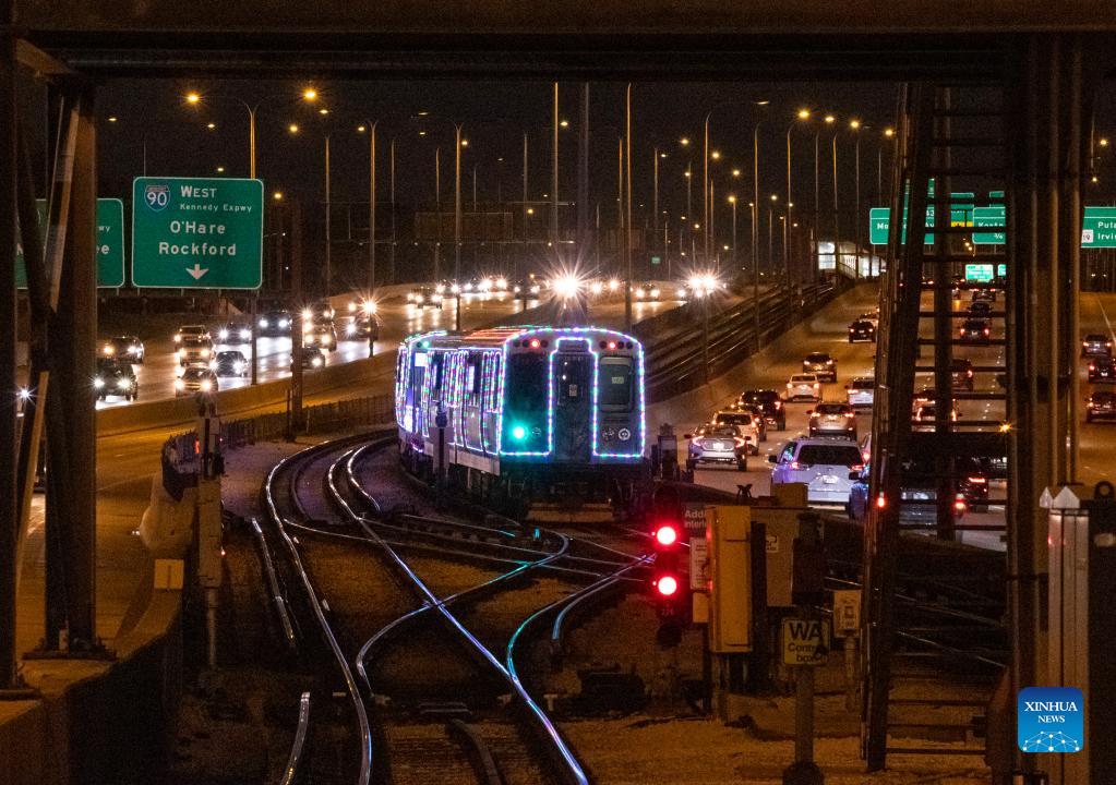 The Holiday Train leaves the Addison station on the Blue Line in Chicago, the United States, Dec. 18, 2021. The year of 2021 marks the 30th anniversary for the Holiday Train service by Chicago Transit Authority. (Photo by Joel Lerner/Xinhua)