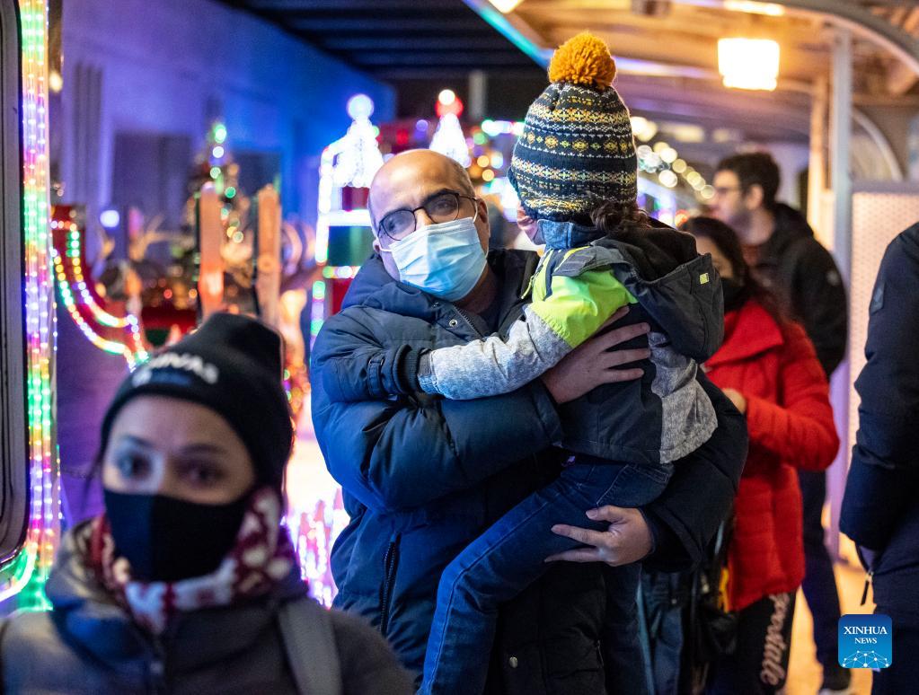 The Holiday Train pulls into Western Ave station on the Blue Line in Chicago, the United States, Dec. 18, 2021. The year of 2021 marks the 30th anniversary for the Holiday Train service by Chicago Transit Authority. (Photo by Joel Lerner/Xinhua)