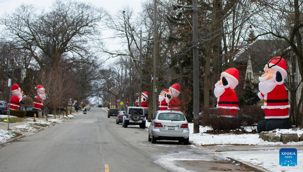 Giant inflatable Santa Clauses are seen outside residential houses on a street in Toronto, Canada, Dec. 23, 2021. (Photo by Zou Zheng/Xinhua)