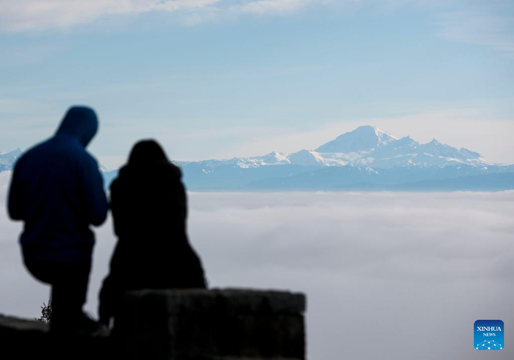 Residents look in the direction of the fog-covered city of Vancouver from Cypress Mountain in Vancouver, Canada, on Jan. 23, 2022. (Photo by Liang Sen/Xinhua)
