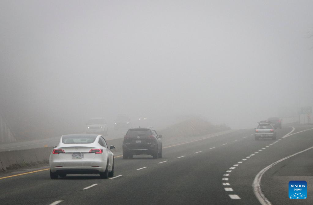 Vehicles travel along a highway under foggy condition in Vancouver, Canada, on Jan. 23, 2022. (Photo by Liang Sen/Xinhua)