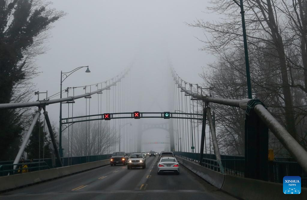 Vehicles travel across the Lions Gate bridge under foggy condition in Vancouver, Canada, on Jan. 23, 2022. (Photo by Liang Sen/Xinhua)