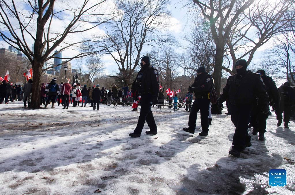 A team of police officers are seen on duty during an anti-mandate demonstration in Toronto, Canada, on Feb. 12, 2022. Protesters gathered here on Saturday for another round of demonstrations in solidarity with the truck convoy protests in Ottawa. The "Freedom Convoy 2022" protest began on Jan. 29 as a rally of truckers against the requirement that Canadian truck drivers crossing the border into the United States be fully vaccinated as of mid-January. (Photo by Zou Zheng/Xinhua)