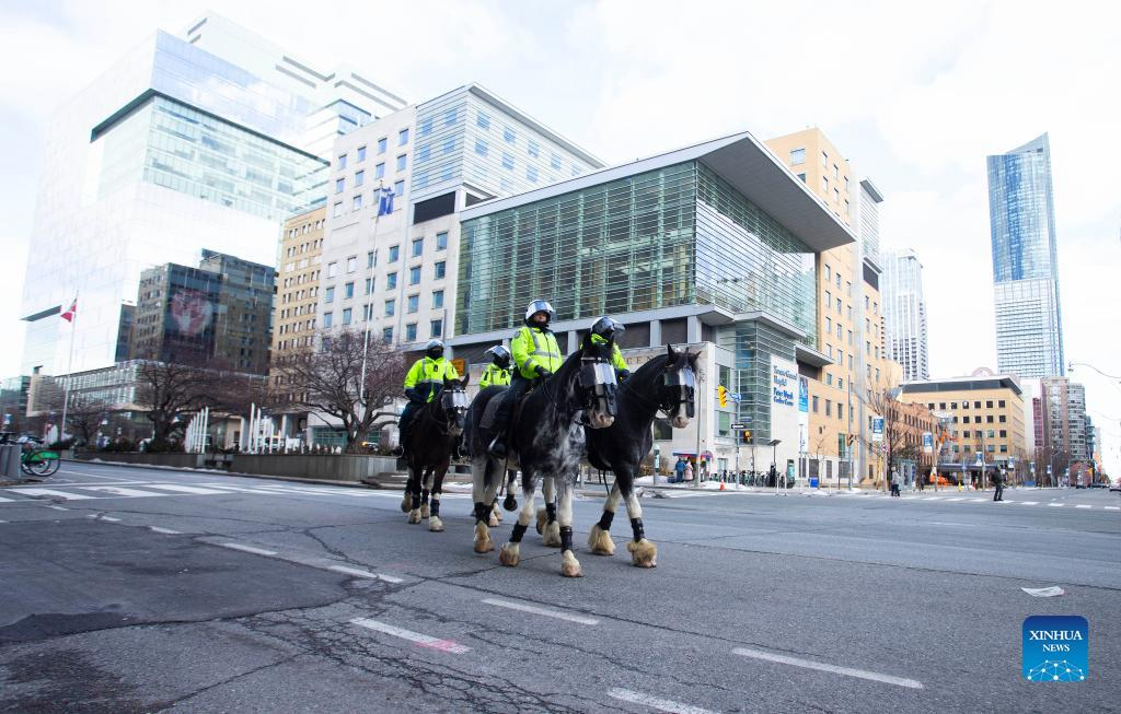 Mounted police officers are seen on duty on a closed street during an anti-mandate demonstration in Toronto, Canada, on Feb. 12, 2022. Protesters gathered here on Saturday for another round of demonstrations in solidarity with the truck convoy protests in Ottawa. The "Freedom Convoy 2022" protest began on Jan. 29 as a rally of truckers against the requirement that Canadian truck drivers crossing the border into the United States be fully vaccinated as of mid-January. (Photo by Zou Zheng/Xinhua)