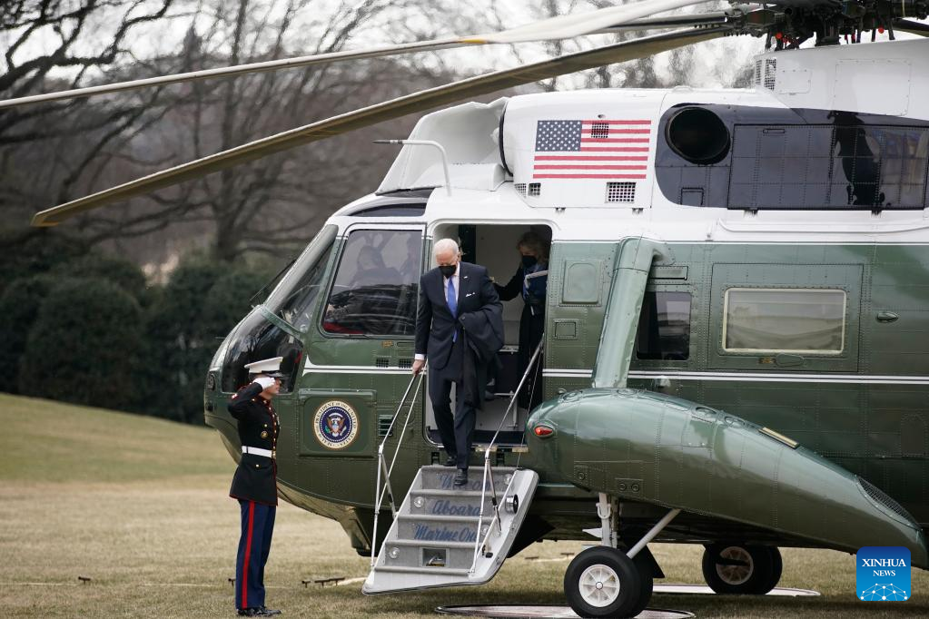 U.S. President Joe Biden gets off and returns to the White House in Washington, D.C., the United States, Feb. 14, 2022.