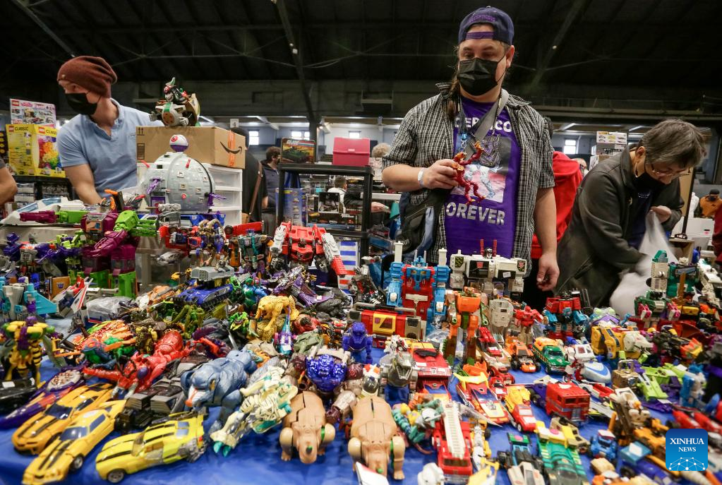 A visitor looks at a toy at the Vancouver Comic and Toy Show in Vancouver, British Columbia, Canada, on Feb. 27, 2022. The Vancouver Comic and Toy Show which was held here on Sunday, features collectible toys, superhero memorabilia, comic books and other similar pop culture items that drawing thousands of collectors and enthusiasts to participate. (Photo by Liang Sen/Xinhua)