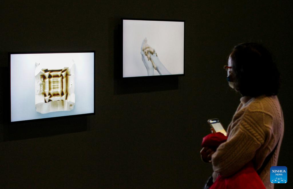 A visitor looks at art works created by using AI technology during the media preview of "The Imitation Game" exhibition at Vancouver Art Gallery in Vancouver, British Columbia, Canada, on March 2, 2022. The exhibition, which runs from March 5 until Oct. 23, 2022, reviews the art and cultural aspect by examining the use of artificial intelligence (AI) technology as a medium in the production of modern art form. (Photo by Liang Sen/Xinhua)