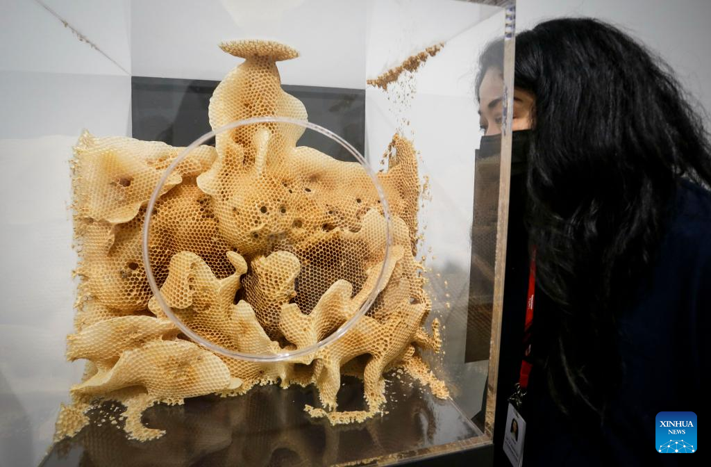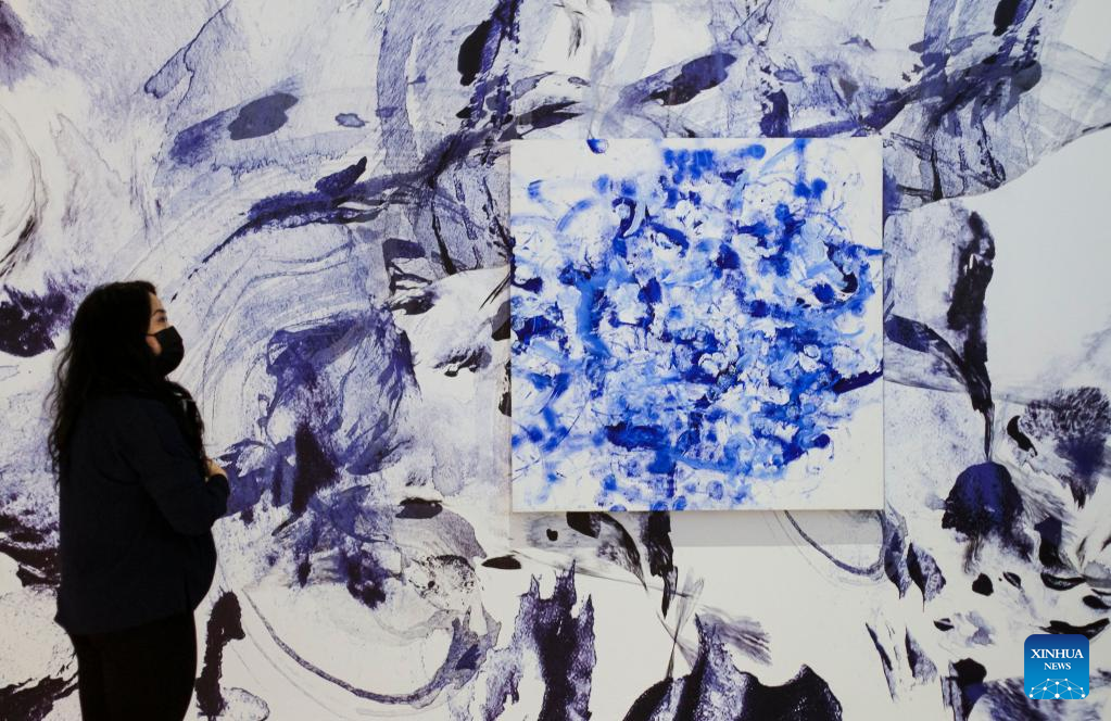 A woman looks at an art work created by using AI and robotic technology during the media preview of "The Imitation Game" exhibition at Vancouver Art Gallery in Vancouver, British Columbia, Canada, on March 2, 2022. The exhibition, which runs from March 5 until Oct. 23, 2022, reviews the art and cultural aspect by examining the use of artificial intelligence (AI) technology as a medium in the production of modern art form. (Photo by Liang Sen/Xinhua)