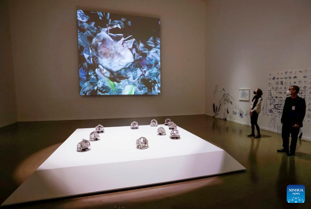 People look at exhibits during the media preview of "The Imitation Game" exhibition at Vancouver Art Gallery in Vancouver, British Columbia, Canada, on March 2, 2022. The exhibition, which runs from March 5 until Oct. 23, 2022, reviews the art and cultural aspect by examining the use of artificial intelligence (AI) technology as a medium in the production of modern art form. (Photo by Liang Sen/Xinhua)