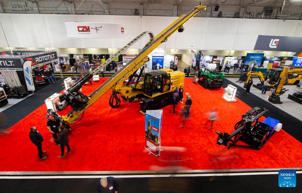 People look at a CZM EK90 drilling rig during the 2022 National Heavy Equipment Show in Mississauga, the Greater Toronto Area, Canada, on March 31, 2022. As one of the largest heavy equipment shows in Canada, the two-day show kicked off here on Thursday, with the participation of exhibitors in road building, construction, snow removal, aggregate, screening and infrastructure sectors. (Photo by Zou Zheng/Xinhua)