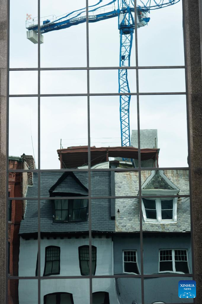 The reflection of a crane and houses is seen in Washington, D.C., the United States, on May 11, 2022. U.S. consumer inflation in April surged by 8.3 percent from a year ago, marking the second straight month of inflation over 8 percent, the U.S. Labor Department reported Wednesday. (Xinhua/Liu Jie)