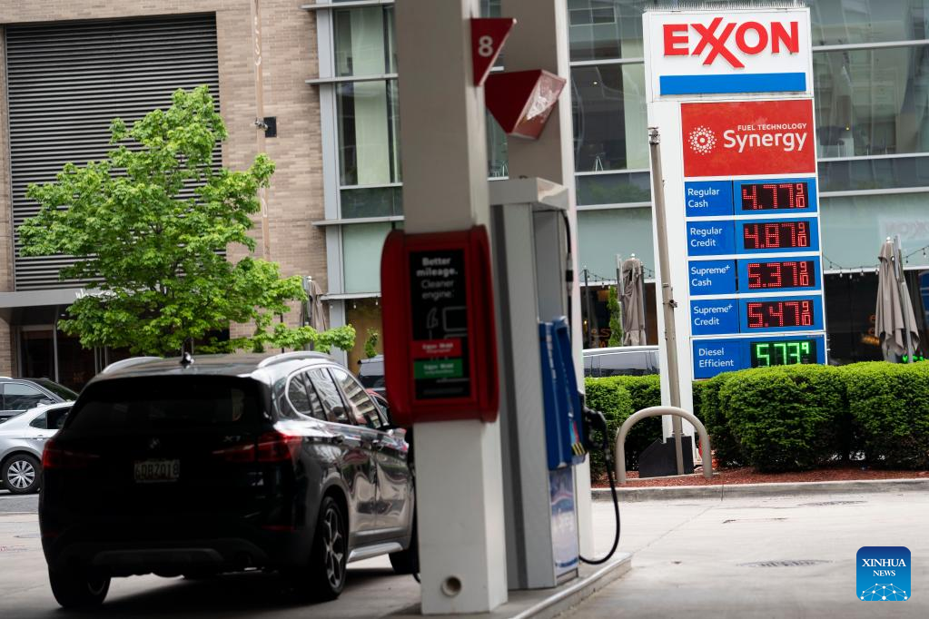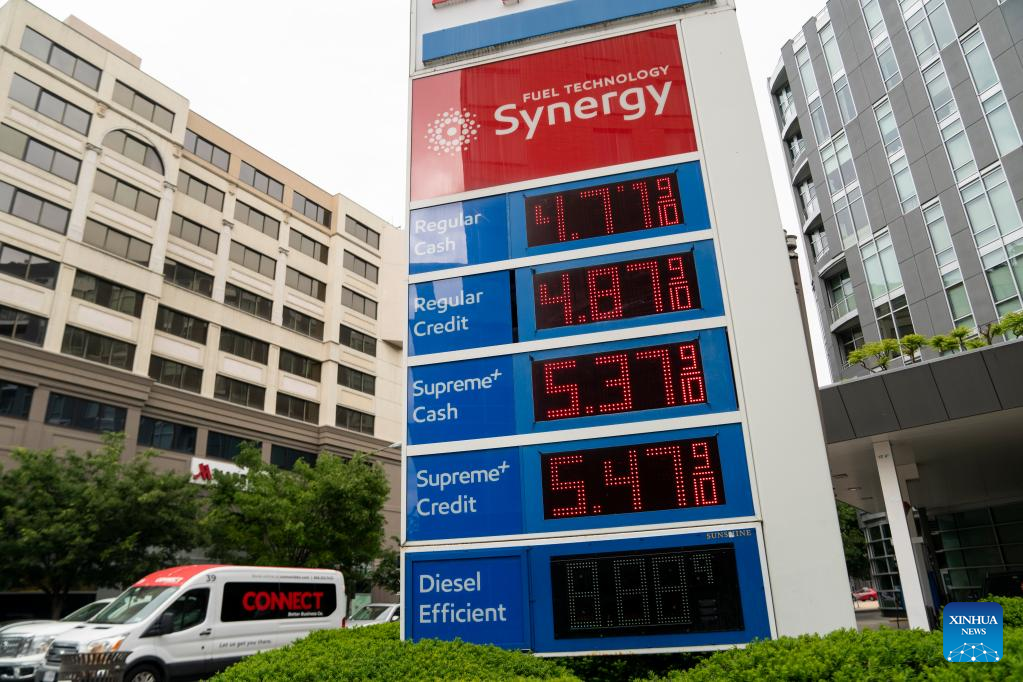 Gas prices are displayed at a gas station in Washington, D.C., the United States, on May 11, 2022. U.S. consumer inflation in April surged by 8.3 percent from a year ago, marking the second straight month of inflation over 8 percent, the U.S. Labor Department reported Wednesday. (Xinhua/Liu Jie)