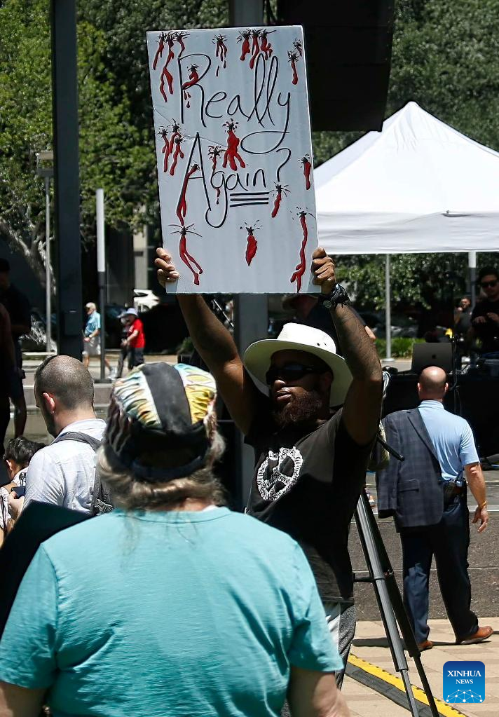 People rally to protest against gun violence in Houston, Texas, the United States, May 27, 2022. Houston, the largest city of the southwestern U.S. state of Texas, is bracing for multiple protests crying for gun control, as the National Rifle Association (NRA) kicks off its annual convention in the city center on Friday, just days after the Uvalde, Texas, school shooting claiming 21 lives. (Photo by Chengyue Lao/Xinhua)