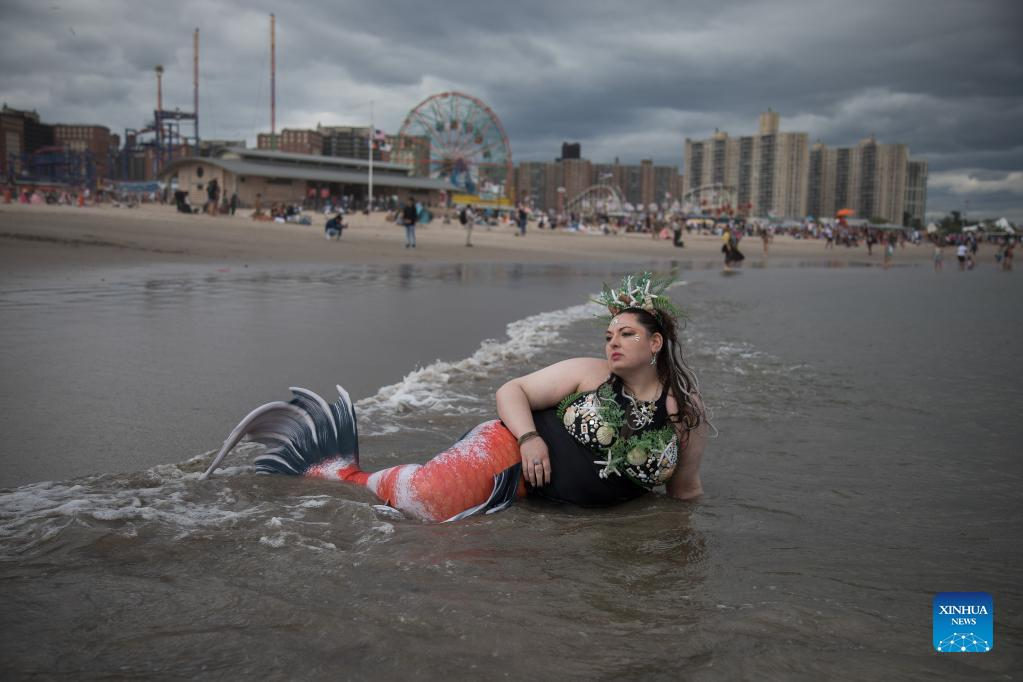 A woman wears mermaid fins in the sea after the 2022 Mermaid Parade at Coney Island in New York, the United States, June 18, 2022. The Mermaid Parade made its in-person return on Saturday after a two-year hiatus due to COVID-19 pandemic. (Photo by Michael Nagle/Xinhua)