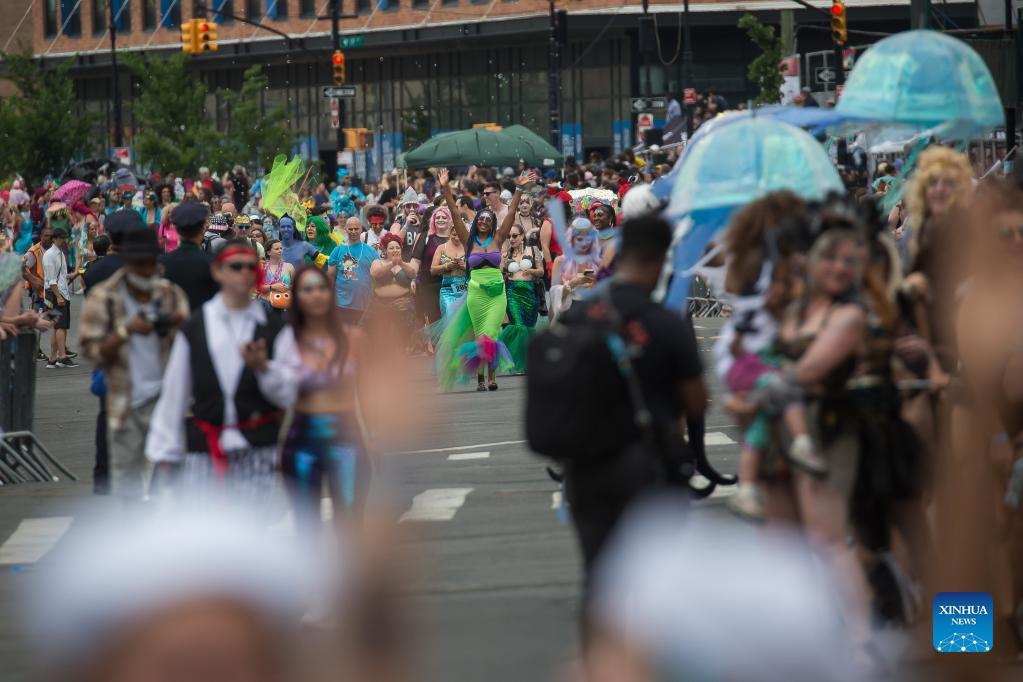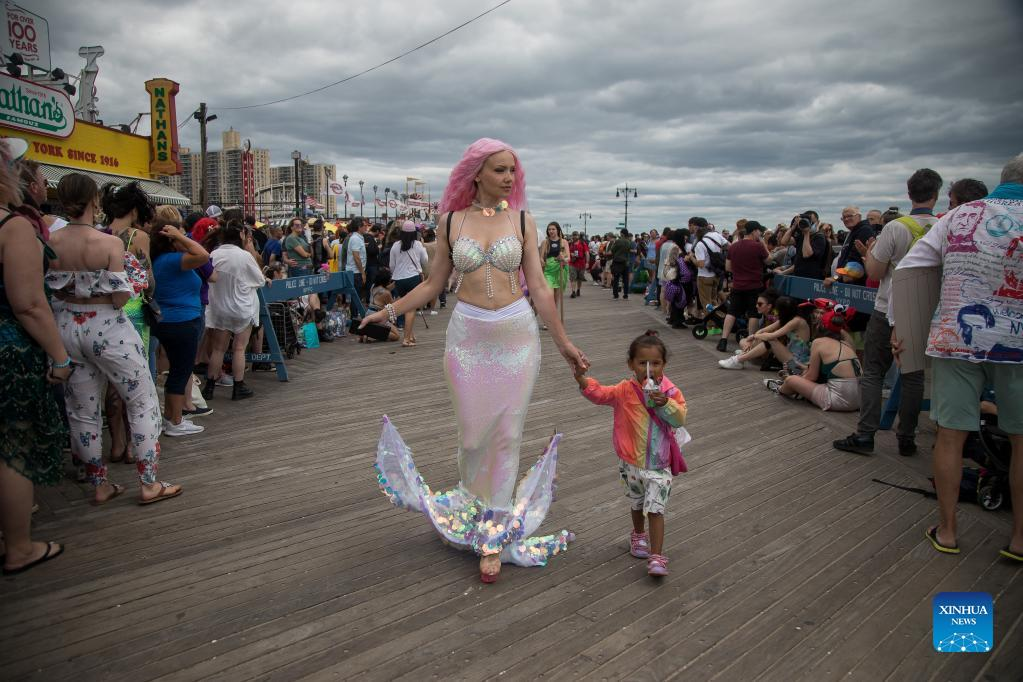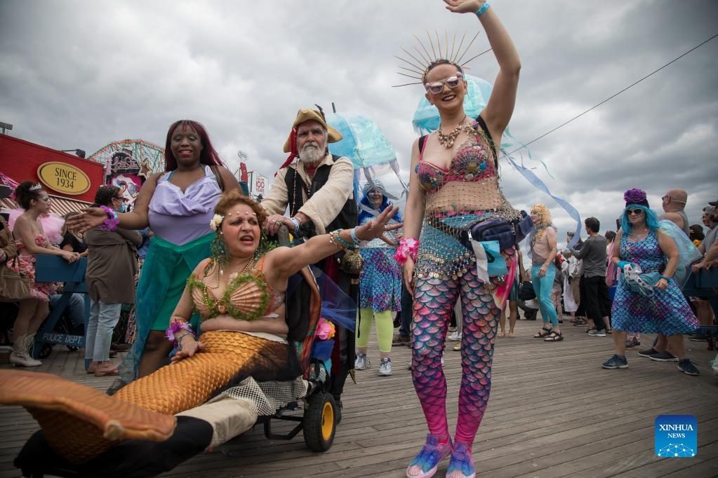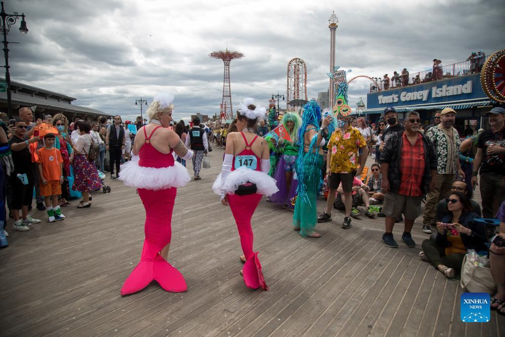 People participate in the 2022 Mermaid Parade at Coney Island in New York, the United States, June 18, 2022. The Mermaid Parade made its in-person return on Saturday after a two-year hiatus due to COVID-19 pandemic. (Photo by Michael Nagle/Xinhua)