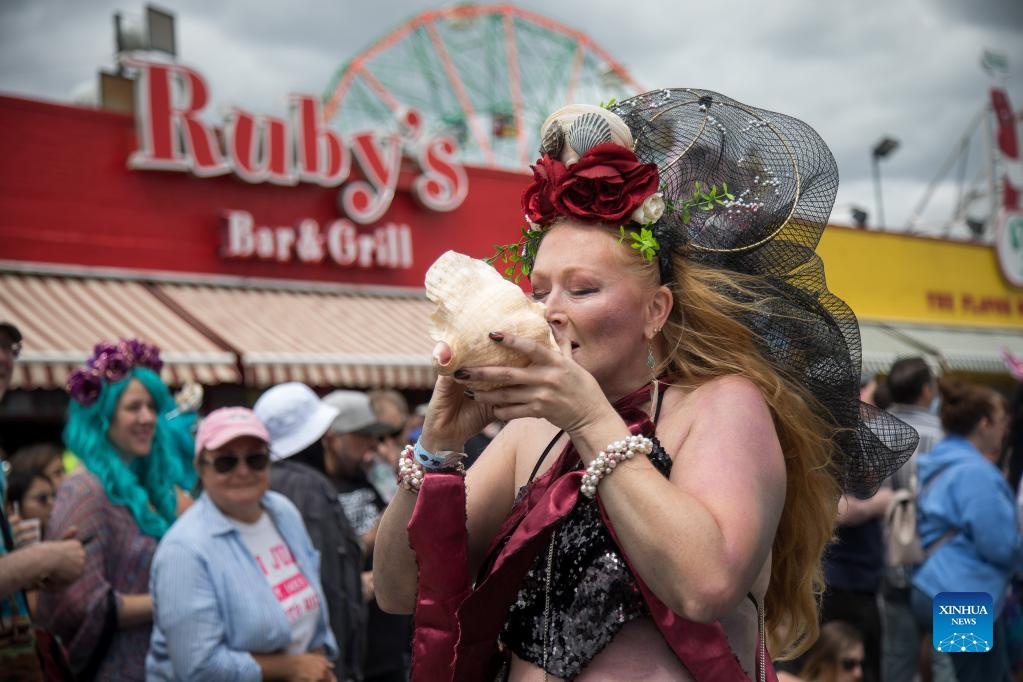 A woman participates in the 2022 Mermaid Parade at Coney Island in New York, the United States, June 18, 2022. The Mermaid Parade made its in-person return on Saturday after a two-year hiatus due to COVID-19 pandemic. (Photo by Michael Nagle/Xinhua)