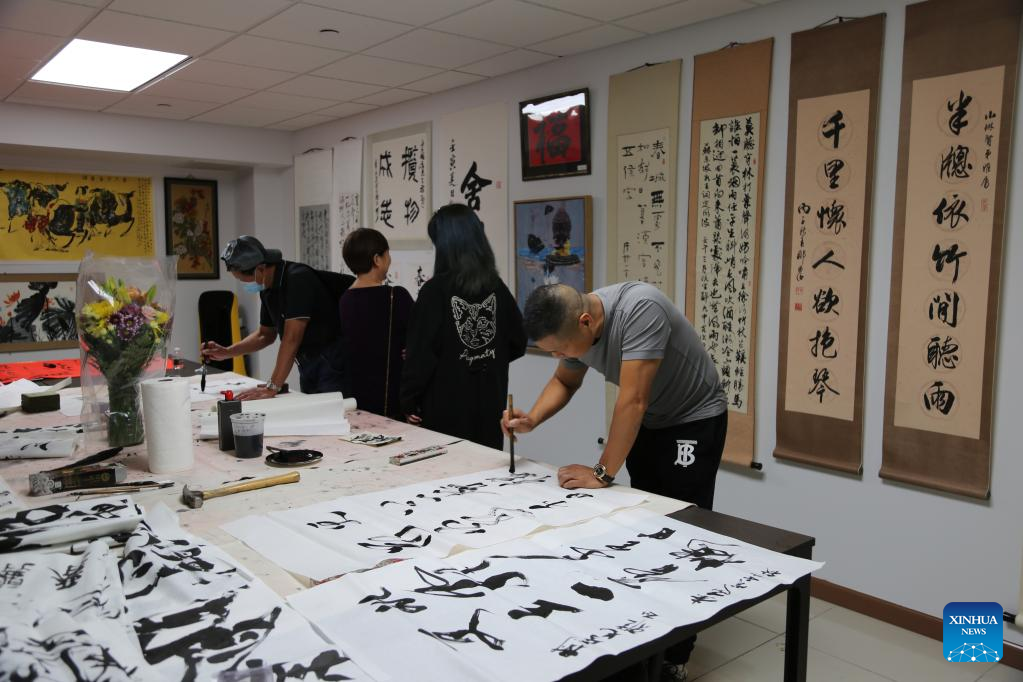 Artists write Chinese calligraphy during a thematic exhibition in New York, the United States, Sept. 9, 2022. A thematic exhibition of traditional Chinese calligraphy and painting works kicked off Friday in Flushing Chinatown of New York City on the occasion of the Mid-Autumn Festival, which falls on Saturday this year. (Xinhua/Liu Yanan)