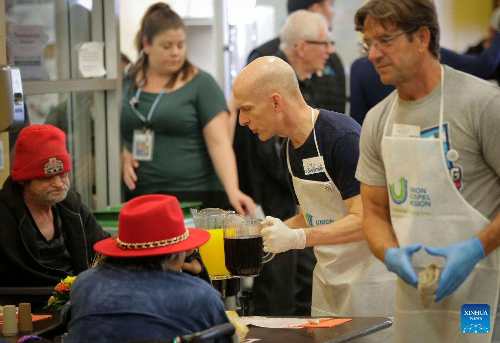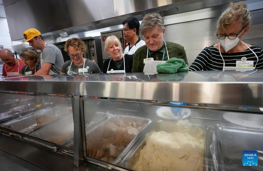 Volunteers help serve free Thanksgiving meals in Vancouver, British Columbia, Canada, on Oct. 10, 2022. About 3,000 free meals were served by a local charitable organization here on Monday. (Photo by Liang Sen/Xinhua)