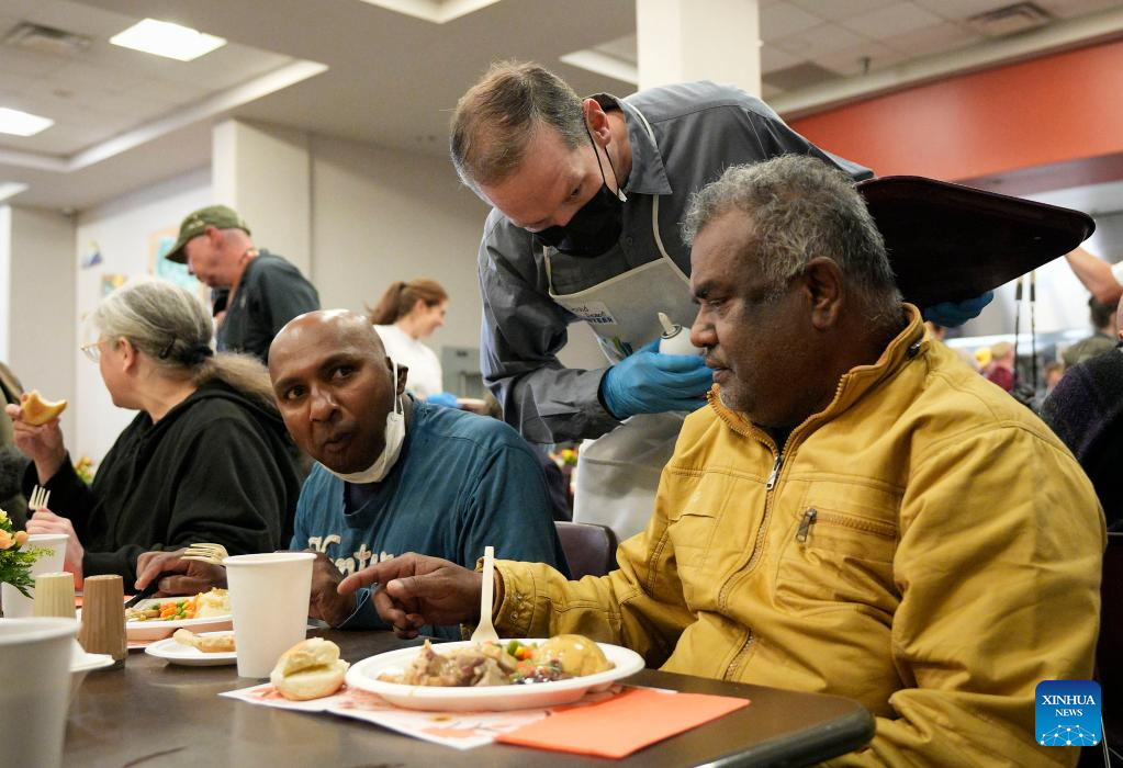 People have free Thanksgiving meals in Vancouver, British Columbia, Canada, on Oct. 10, 2022. About 3,000 free meals were served by a local charitable organization here on Monday. (Photo by Liang Sen/Xinhua)
