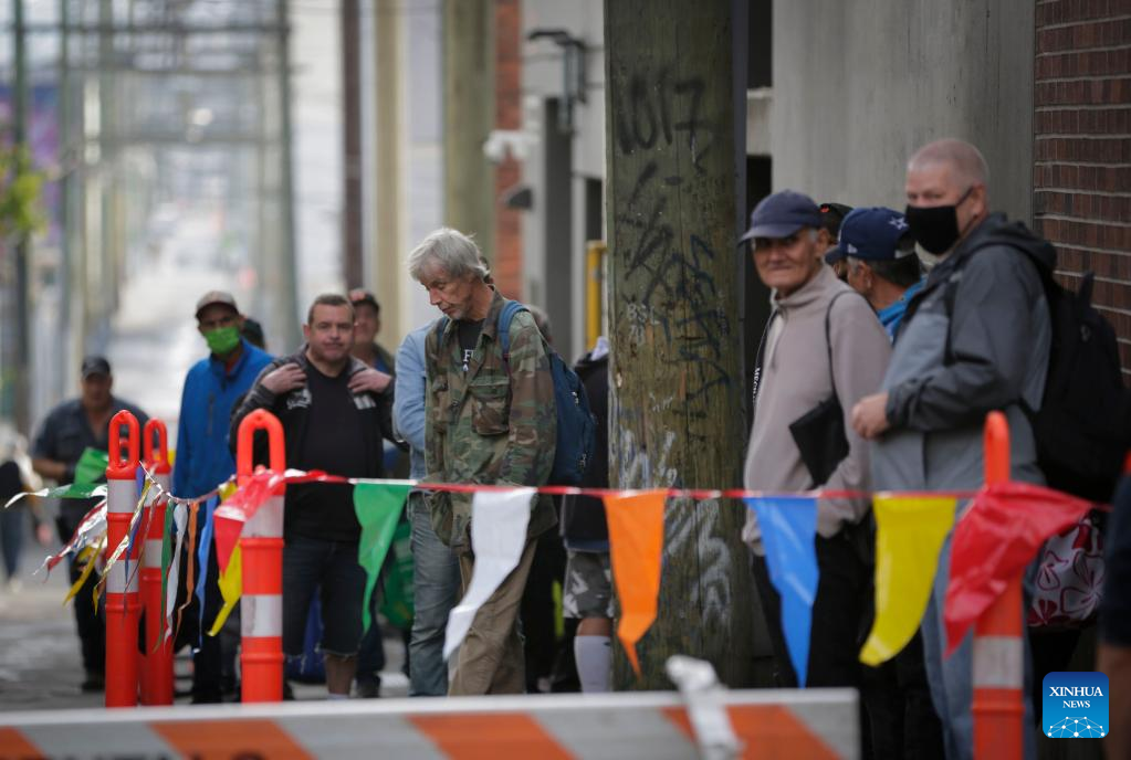 People line up for free Thanksgiving meals in Vancouver, British Columbia, Canada, on Oct. 10, 2022. About 3,000 free meals were served by a local charitable organization here on Monday. (Photo by Liang Sen/Xinhua)