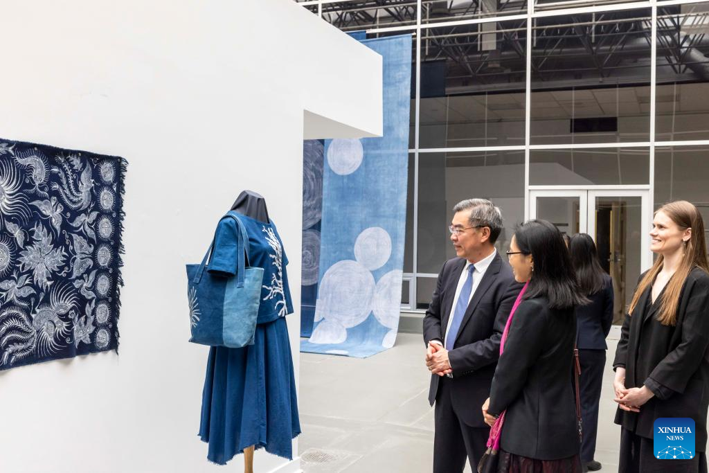 Huang Ping (1st L), the Chinese consul general in New York, views exhibits at an exhibition "Textile Arts from Guizhou of China," which is on view during an international symposium "Across Time and Space: The Silk Road and the Silk City," at the William Paterson University (WP) in Wayne, New Jersey, the United States, on Oct. 26, 2022. Known as U.S. "Silk City," Paterson, in the northeastern U.S. state of New Jersey, was considered to be the final stop for China's historic Silk Road that connected civilizations of different parts of the ancient world.