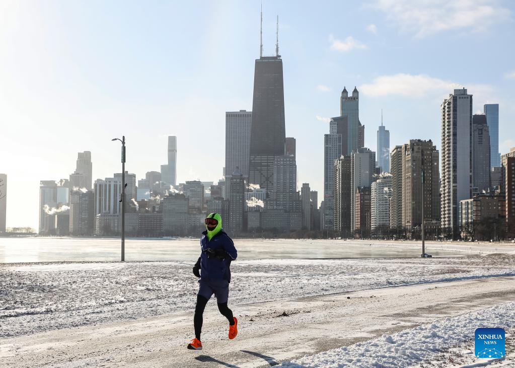 A man runs by North Ave. Beach in Chicago, the United States, on Dec. 24, 2022. A strong winter storm swept through Chicago. (Photo by Joel Lerner/Xinhua)