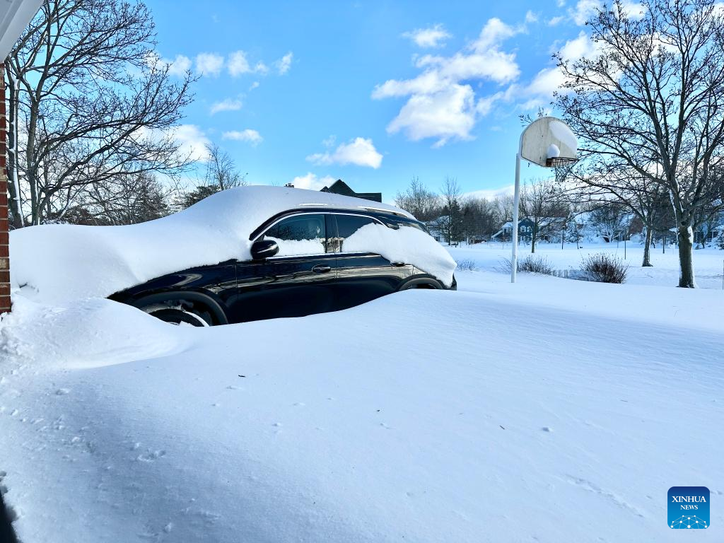 A vehicle is partially buried by snow in Amherst, Erie County, New York State, the United States, Dec. 25, 2022. A major winter storm has taken at least 23 lives across the United States as of Saturday evening, according to NBC News. The media outlet reported that deaths had occurred in the states of Oklahoma, Kentucky, Missouri, Tennessee, Wisconsin, Kansas, Nebraska, Ohio, New York, Colorado, and Michigan. (Photo by Xuehong Lyu/Xinhua)