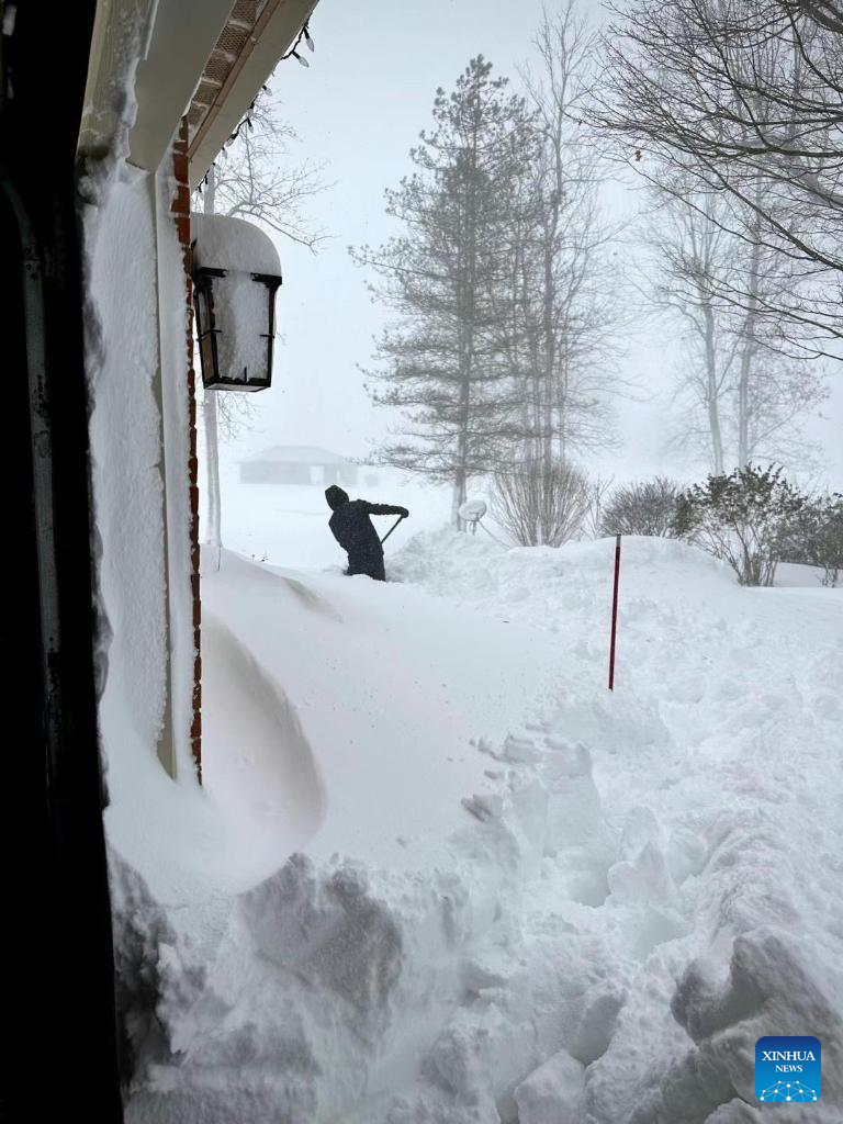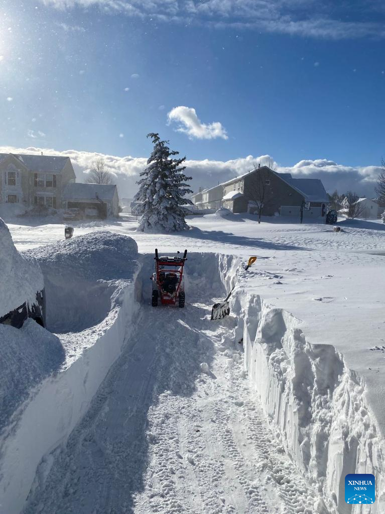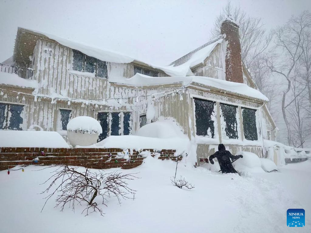 A resident removes snow from a building in Amherst, Erie County, New York State, the United States, Dec. 24, 2022. A major winter storm has taken at least 23 lives across the United States as of Saturday evening, according to NBC News. The media outlet reported that deaths had occurred in the states of Oklahoma, Kentucky, Missouri, Tennessee, Wisconsin, Kansas, Nebraska, Ohio, New York, Colorado, and Michigan. (Xinhua)