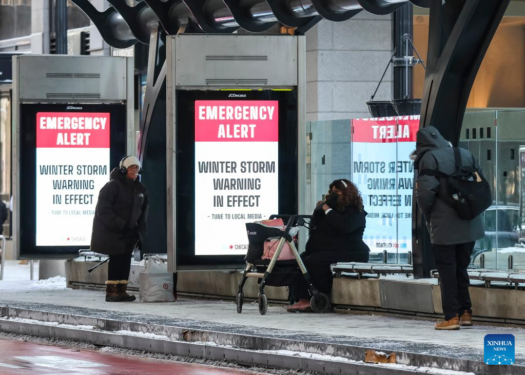 People wait for bus in Chicago, the United States, on Dec. 24, 2022. A strong winter storm swept through Chicago. (Photo by Joel Lerner/Xinhua)