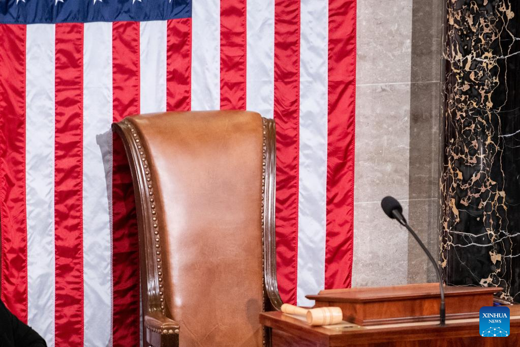Photo taken on Jan. 6, 2023 shows the empty chair of the speaker of the U.S. House of Representatives in Washington, D.C., the United States. The U.S. House of Representatives has adjourned until late Friday night as Congressman Kevin McCarthy is seeking to flip more Republican holdouts to overcome the embarrassing speakership impasse. (Xinhua/Liu Jie)