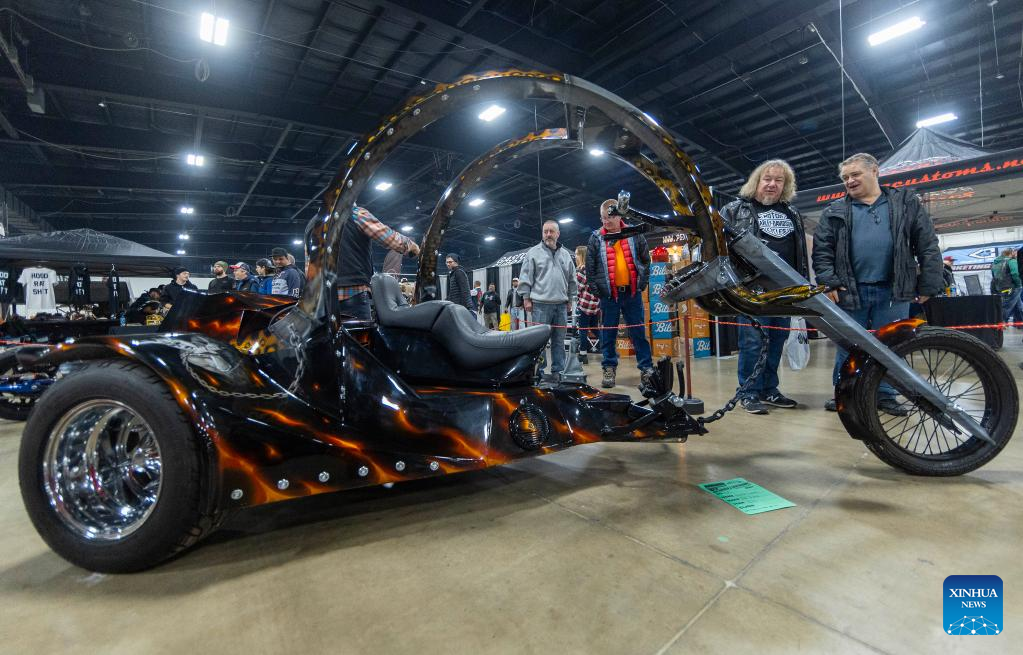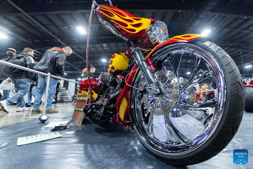 People look at a customized motorcycle during the 2023 North American International Motorcycle Supershow in Mississauga, the Greater Toronto Area, Canada, on Jan. 7, 2023. This annual event is held here from Friday to Sunday with over 1,000 motorcycles from above 500 exhibitors. (Photo by Zou Zheng/Xinhua)
