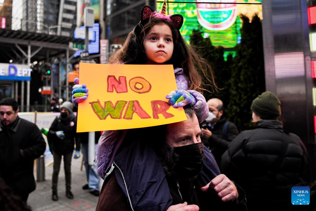 A child holds an anti-war sign during a rally at Times Square in New York, the United States, Jan. 14, 2023.