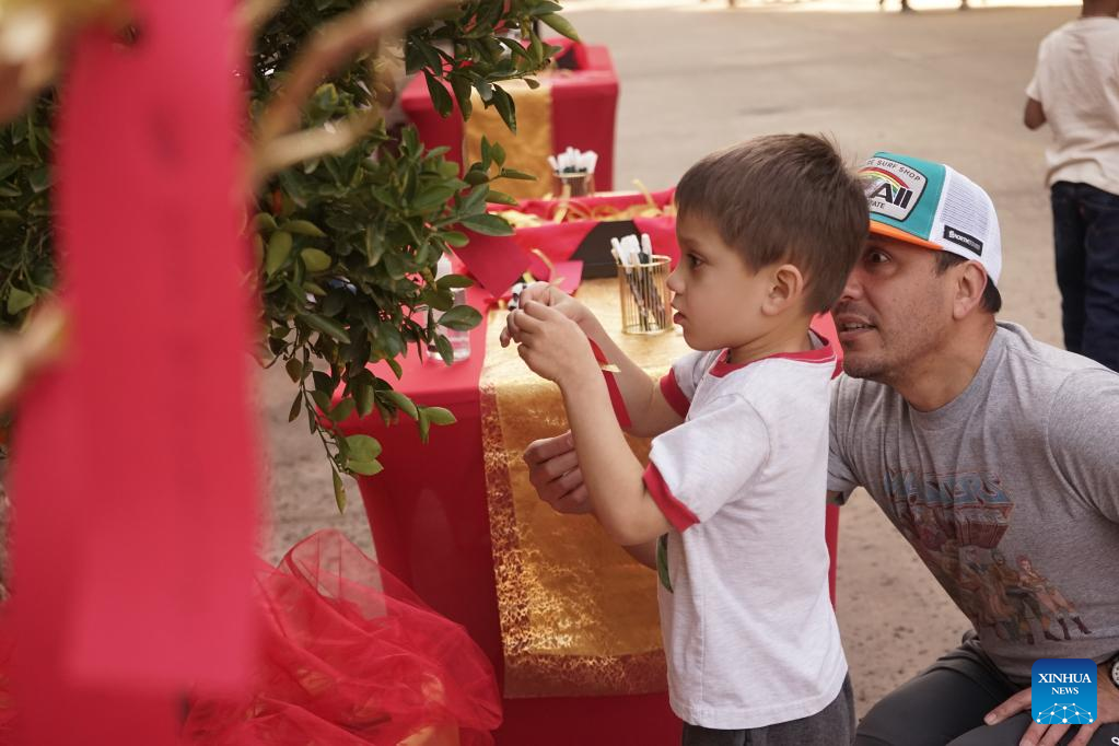 A boy attaches a note of wishes on the wish tree at San Diego Zoo, in San Diego, California, the United States, on Feb. 4, 2023. The San Diego Zoo, which has the largest number of annual visitors among U.S. zoos, kicked off a two-day special event on Saturday to celebrate the Chinese New Year. (Photo by Zeng Hui/ Xinhua)